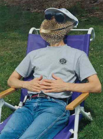 | Here is a photo of one of the "victims" of the seductive nature of durian. He has just consumed an entire durian. You can sense his euphoria by the grin on his face. The sunglasses hide the glazed look in his eyes. | ![]() |